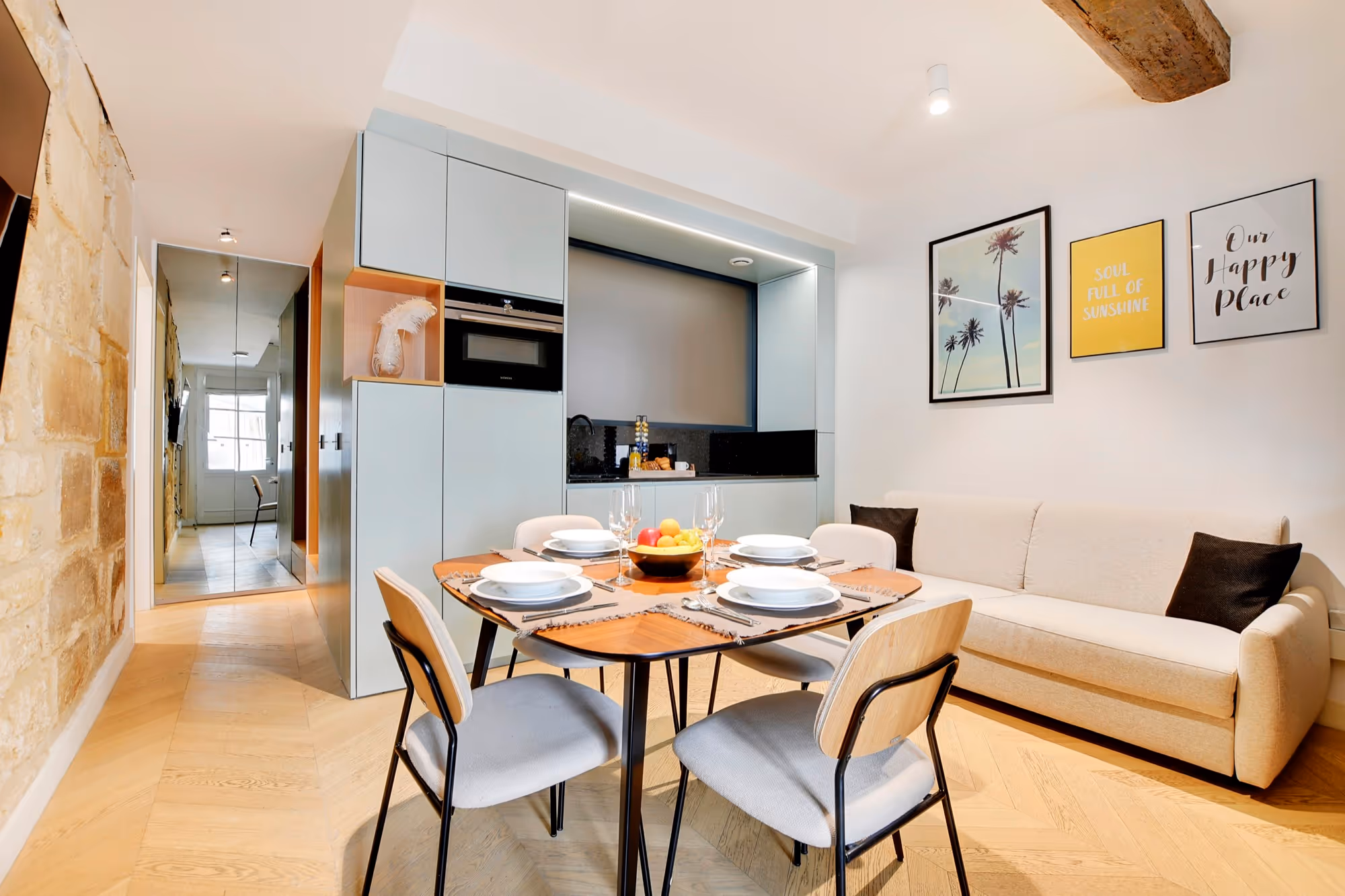 Ce bel appartement de 52 m² est situé au rez-de-chaussée d'une cour calme, au 14 rue de Birague. Idéalement situé au plus près de la place des Vosges, et proche du Marais, il bénéficie d'une localisation exclusive et vous invite à séjourner au plus près de l'activité culturelle de Paris.\n\nIl s'ouvre sur un séjour spacieux, où vous trouverez une télévision connectées, et un canapé convertible pour deux personnes.\nLa cuisine entièrement équipée dispose de tout l'électroménager nécessaire pour un séjour comme à la maison, ainsi qu'un coin repas, idéal pour partager des moments de convivialité, discuter ou travailler.\n\nAu même niveau, la chambre principale est équipée d'un lit Queen-Size ainsi que d'une literie de qualité hôtelière.\nDe l'autre côté du couloir, la salle de bain dispose d'une grande douche à l'italienne et d'un WC.\n\nL'atout majeur de cet appartement, un escalier menant à un étage destiné à la détente. \nComposé d'un coin salon avec un canapé confortable et une grande télévision connectée, et d'un superbe sauna où vous pourrez vous détendre après une longue journée de visites.\n\n\nPour un maximum de confort, cet appartement dispose d'un lave-linge séchant, d'un lave-vaisselle, d'un micro-ondes, d'une machine à café Nespresso, et du wifi au débit.\n\n\nNous proposons des options d'arrivée simplifiées :\n\n- Vous pourrez accéder à votre appartement dès qu'il sera prêt. Nous sommes toujours disponibles par téléphone ou par chat si vous avez besoin de quoi que ce soit.\n\n- Nous recommandons également notre option de service de chauffeur premium. Notre chauffeur vous attendra à la sortie avec votre nom et vous conduira directement à l'appartement.\n