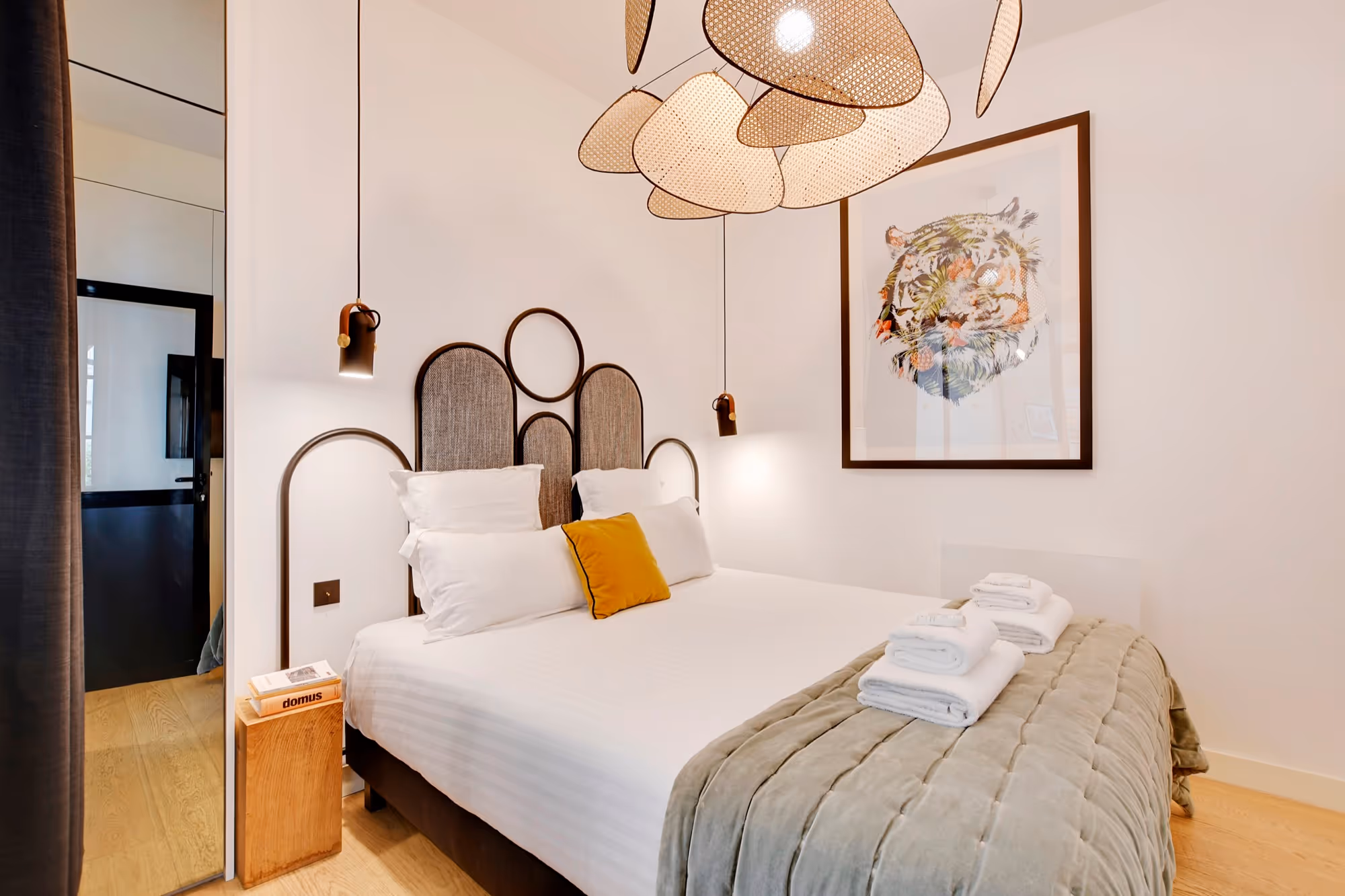 Ce bel appartement de 108 m² est situé au rez-de-chaussée d'une cour calme, au 14 rue de Birague. Idéalement situé au plus près de la place des Vosges, et proche du Marais, il bénéficie d'une localisation exclusive et vous invite à séjourner au plus près de l'activité culturelle de Paris.\n\nIl s'ouvre sur un séjour spacieux, où vous trouverez une télévision connectées, et un canapé convertible pour deux personnes.\nLa cuisine entièrement équipée dispose de tout l'électroménager nécessaire pour un séjour comme à la maison, ainsi qu'un coin repas, idéal pour partager des moments de convivialité, discuter ou travailler.\n\nAu même niveau, la chambre principale est équipée d'un lit Queen-Size ainsi que d'une literie de qualité hôtelière, elle possède sa propre salle de bain attenante avec une grande douche à l'italienne et un WC.\nLa seconde chambre est également équipée d'un lit Queen-Size.\n\nDe l'autre côté du couloir, la seconde salle de bain dispose d'une belle douche à l'italienne et d'un WC.\n\n\nL'atout majeur de cet appartement, un escalier menant à un étage destiné à la détente. \nCette espace exceptionnel est composé d'un coin salon avec un canapé confortable et une télévision connectée, ainsi que d'un espace bar avec une cave à vin et un petit réfrigérateur, parfait pour préparer de délicieux cocktails, et d'un beau sauna où vous pourrez vous détendre après une longue journée de visites.\n\nL'appartement possède également son propre home cinéma, équipé d'un vidéoprojecteur et de confortables fauteuils de cinéma vous permettant de profiter des meilleurs films en intimité. \n\n\n\nPour un maximum de confort, cet appartement dispose d'un lave-linge séchant, d'un lave-vaisselle, d'une machine à café Nespresso, et du wifi haut débit.\n\nNous proposons des options d'arrivée simplifiées :\n\n- Vous pourrez accéder à votre appartement dès qu'il sera prêt. Nous sommes toujours disponibles par téléphone ou par chat si vous avez besoin de quoi que ce soit.\n- Nous recommandons également notre option de service de chauffeur premium. Notre chauffeur vous attendra à la sortie avec votre nom et vous conduira directement à l'appartement.