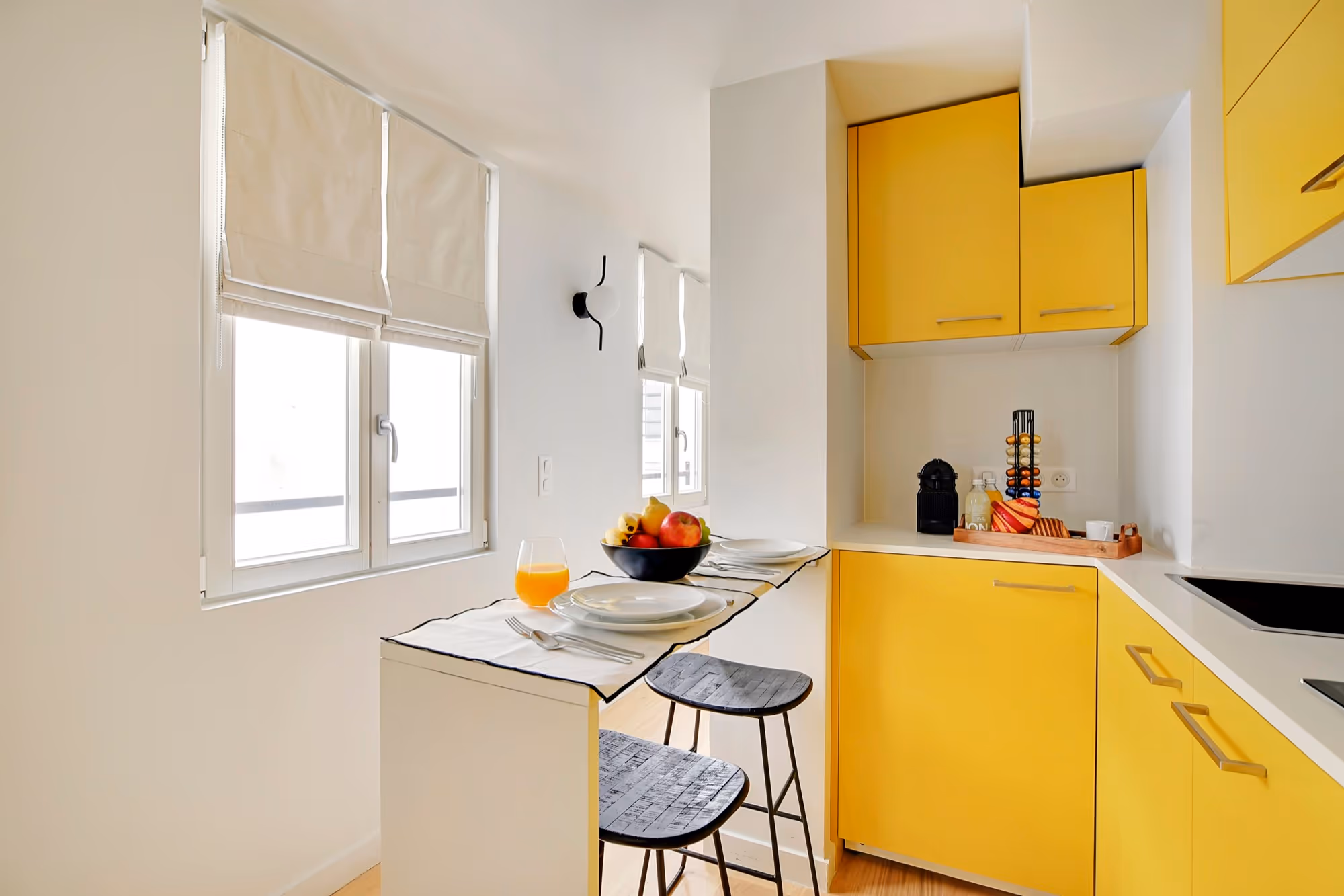 Situé au 1er étage d'un immeuble sans ascenseur, ce joli studio lumineux possède un design moderne, et dispose de tout le confort nécessaire pour accueillir deux personnes grâce à son aménagement moderne et optimal. \n\nIl s'ouvre sur une cuisine entièrement équipée et fonctionnelle, possédant de nombreux rangements. \nLe séjour lumineux bénéficie d'un canapé-lit confortable pour deux personnes, et d'une télévision connectée.\n\nLa salle de bain séparée est composée d'une douche à l'italienne et d'une toilette. \n\nCet appartement est particulièrement bien agencé pour facilité et optimiser votre séjour dans la capital. \n\nCe studio dispose de draps et de serviettes de qualité hôtelière ainsi que du wifi à haut débit.\n\nNous proposons des options d'arrivée simplifiées :\n\n- Vous pourrez accéder à votre appartement dès qu'il sera prêt. Nous sommes toujours disponibles par téléphone ou par chat si vous avez besoin de quoi que ce soit.\n- Nous recommandons également notre option de service de chauffeur premium. Notre chauffeur vous attendra à la sortie avec votre nom et vous conduira directement à l'appartement.